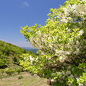三峰山では、5月中旬から下旬に山頂周辺に群生している白つつじ(シロヤシオ、ゴヨウツツジ)が白い花を一斉に咲かせ、登山道を彩ります。青空の下、白い花と木々の新緑が生み出す上品なコントラストは清々しく、毎年白つつじを求めて多くの登山客が訪れます。